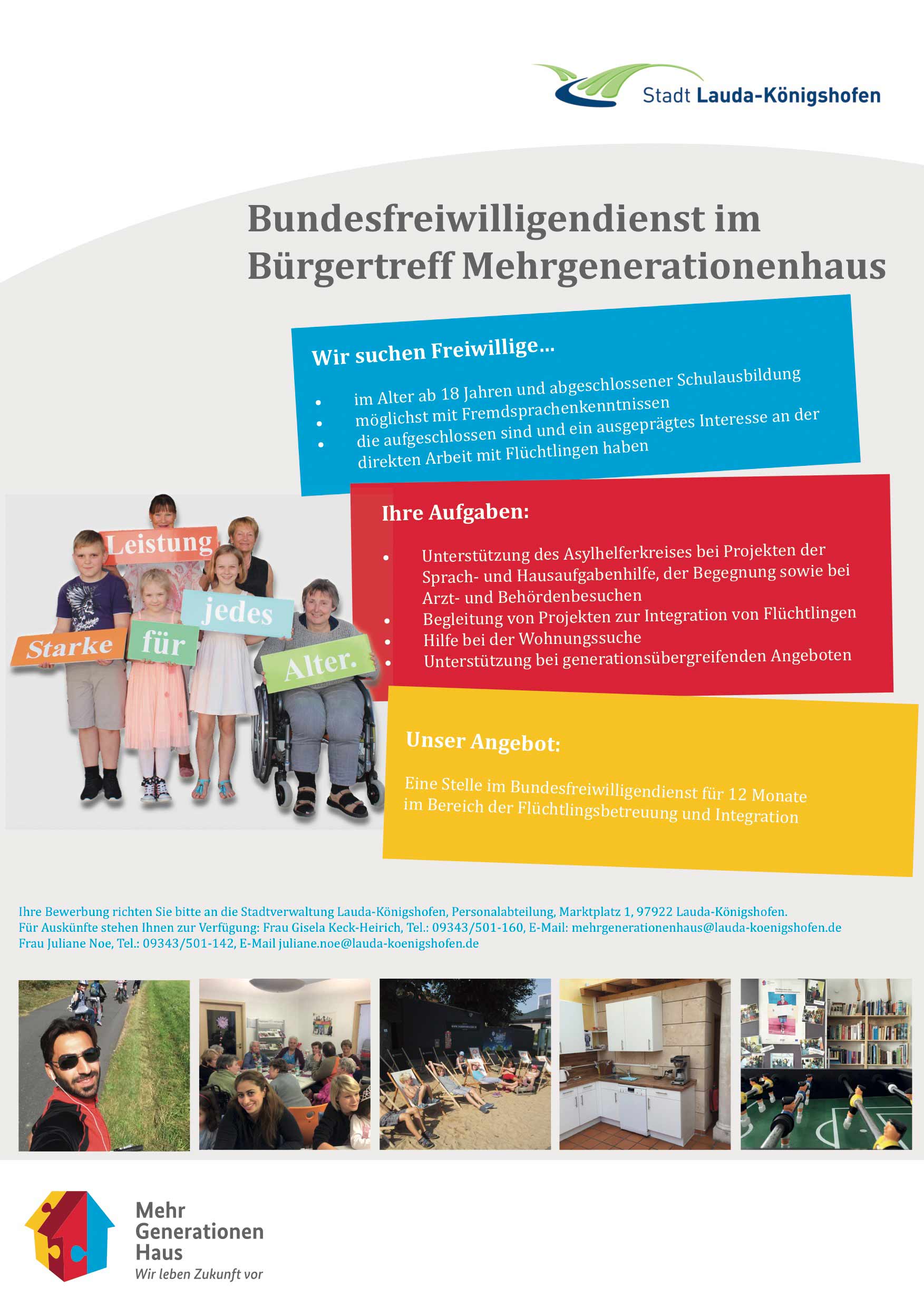 - Eine Stelle im Bundesfreiwilligendienst für 12 Monate im Bereich der Flüchtlingsbetreuung und Integration